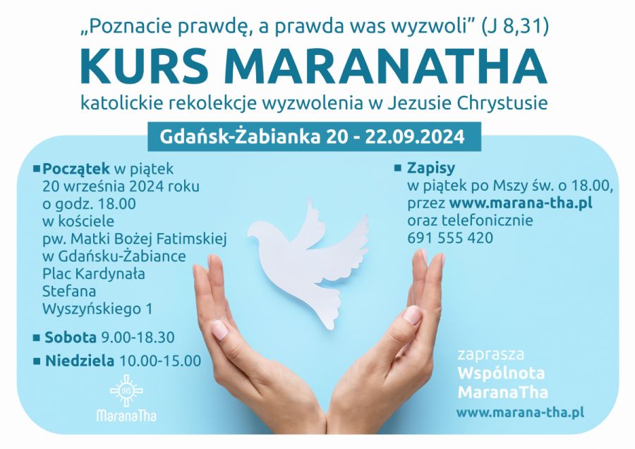 Najbliższe Rekolekcje Maranatha odbędą się w parafii pw. Matki Bożej Fatimskiej w Gdańsku-Żabiance (Plac Kardynała Stefana Wyszyńskiego 1) w dniach 20-22 września 2024.