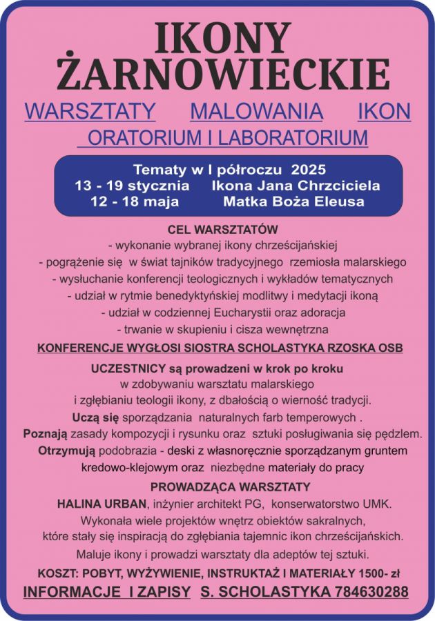 Celem warsztatów jest namalowanie ikony. Uczestnicy wchodzą na drogę ikonopisarstwa w klimacie twórczego skupienia i modlitwy. Są prowadzeni w krok po kroku w zdobywaniu warsztatu malarskiego i zgłębianiu teologii ikony. Prowadzę warsztaty z dbałością o wierność tradycji: uczę sporządzania tradycyjnego spoiwa do farb temperowych i tworzenia kompozycji kolorów z palety pigmentów. Podobraziem są deski z własnoręcznie sporządzonym gruntem kredowo-klejowym. Kolejne warstwy malarskie niepostrzeżenie stają się pełne świateł i laserunków, wibrują w nich linie pełnewyrazu i staranne zdobienia – wszystko dla OBLICZA.