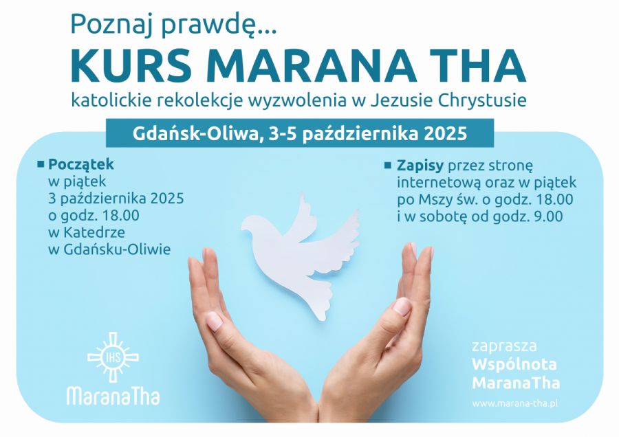 Najbliższe Rekolekcje Maranatha odbędą się w Gdańsku-Oliwie w dniach 3-5 października 2025.