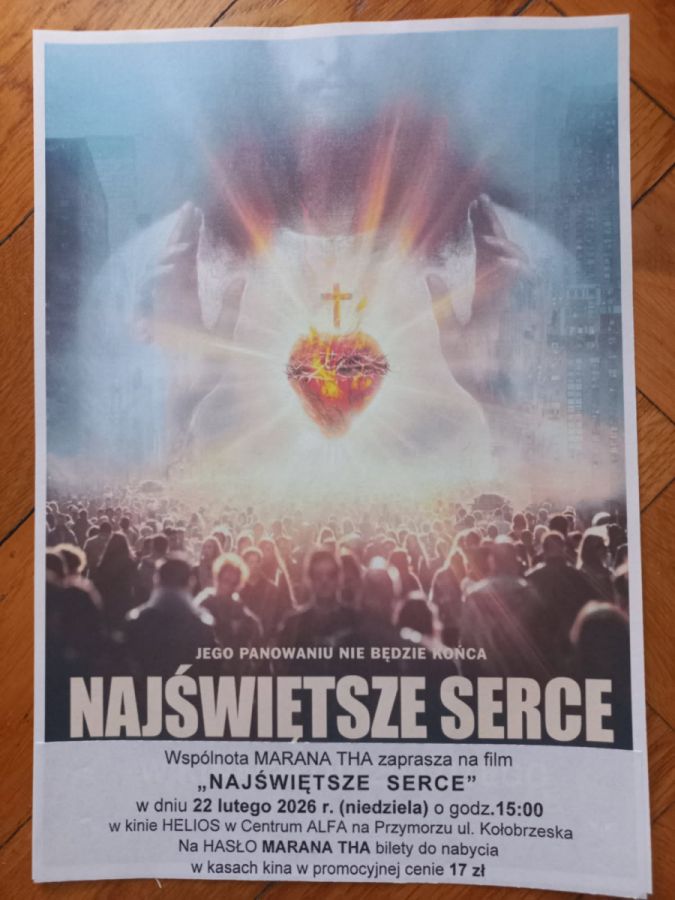 “Najświętsze Serce“ zostanie wyświetlony w kinie Helios w Alfa Centrum w Gdańsku-Przymorzu w niedzielę 22 lutego o godz. 15.00. Bilety w cenie 17 zł do nabycia w kasach kina przed seansem na hasło MARANATHA. Serdecznie zapraszamy.