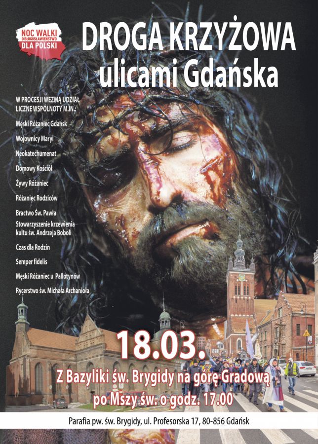 Dostaliśmy zaproszenie na Drogę Krzyżową ulicami Gdańska z Bazyliki św. Brygidy na Górę Gradową, w piątek 18.03.22, po Mszy św. o godz. 17.00 (przejście od ok. 17.45 do 19.30)