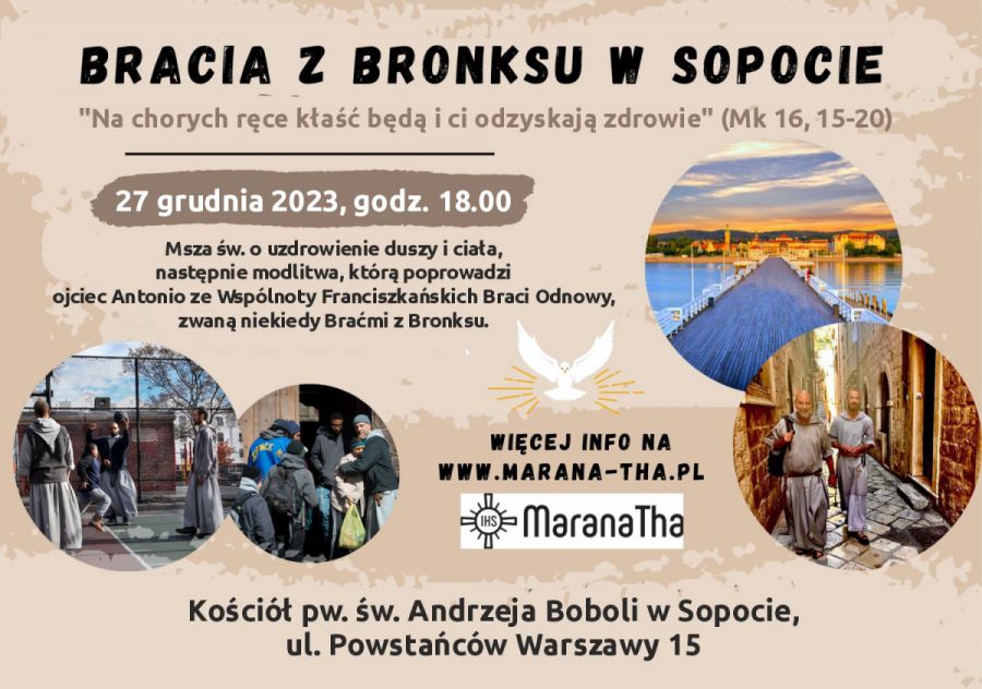 Wspólnota MaranaTha zaprasza na modlitwę wstawienniczą wszystkich, którzy potrzebują umocnienia. Modlitwę poprowadzi ojciec Antonio ze Wspólnoty Franciszkańskich Braci Odnowy, zwaną niekiedy Braćmi z Bronksu.