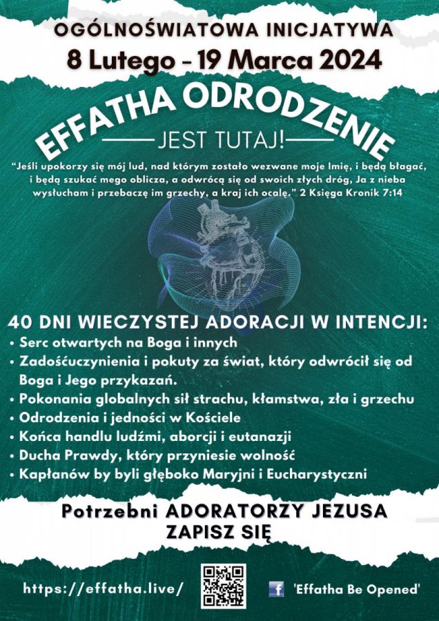 Osoby, które chciałyby wziąć udział w Adoracji Najświętszego Sakramentu w intencjach podanych na plakacie powinny wejść na stronę internetową: https://effatha.live/