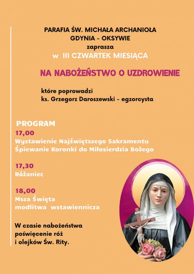 Zapraszamy w III czwartek miesiąca - 18 kwietnia 2024 r. do wspólnej modlitwy w kościele pw. Św. Michała Archanioła Gdynia Oksywie na wieczorną Mszę Świeta.