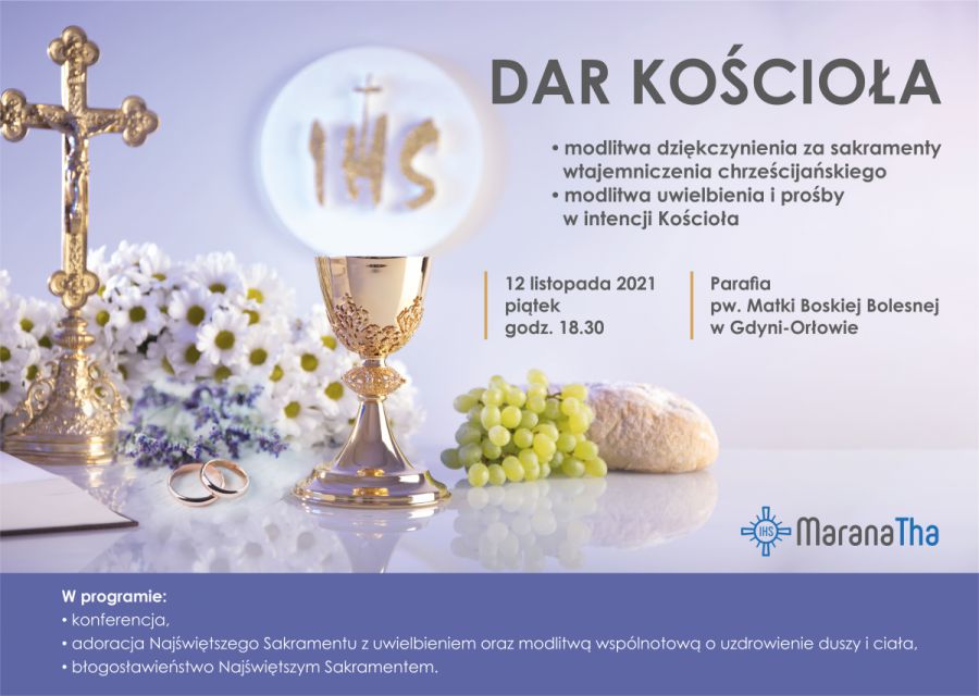 ZAPRASZAMY w piątek 12 listopada 2021 do kościoła pw. Matki Boskiej Bolesnej w Gdyni-Orłowie na modlitwę dziękczynienia za sakramenty wtajemniczenia chrześcijańskiego, a także modlitwę uwielbienia i prośby w intencji Kościoła, po wieczornej Mszy św. o godz. 18:30.