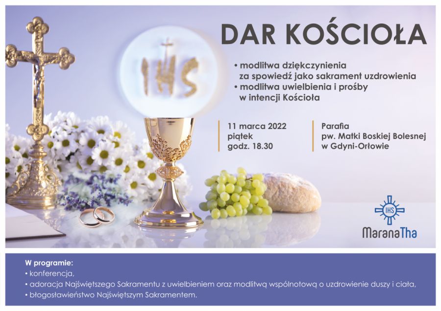 ZAPRASZAMY w piątek 11 marca 2022 r. do kościoła pw. Matki Boskiej Bolesnej w Gdyni-Orłowie na modlitwę dziękczynienia za sakrament spowiedzi jako sakrament uzdrowienia (II), a także modlitwę uwielbienia i prośby w intencji Kościoła, po wieczornej Mszy św. o godz. 18:30.